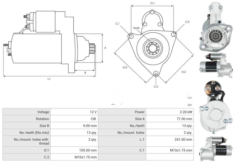 Starters Voltage [ V ] 12 Power [ kW ] 2.20 Rotation CW Size A [ mm ] 77.00 Size B [ mm ] 9.00 No./teeth [ qty. ] 13 No./teeth (fits into) [ qty. ] 13 No./mount. holes [ qty. ] 2 No./mount. holes with thread [ qty. ] 2 L.1 [ mm ] 241.00 O.1 [ mm ] 105.00 C.1 [ mm ] M10x1.75 C.2 [ mm ] M10x1.75