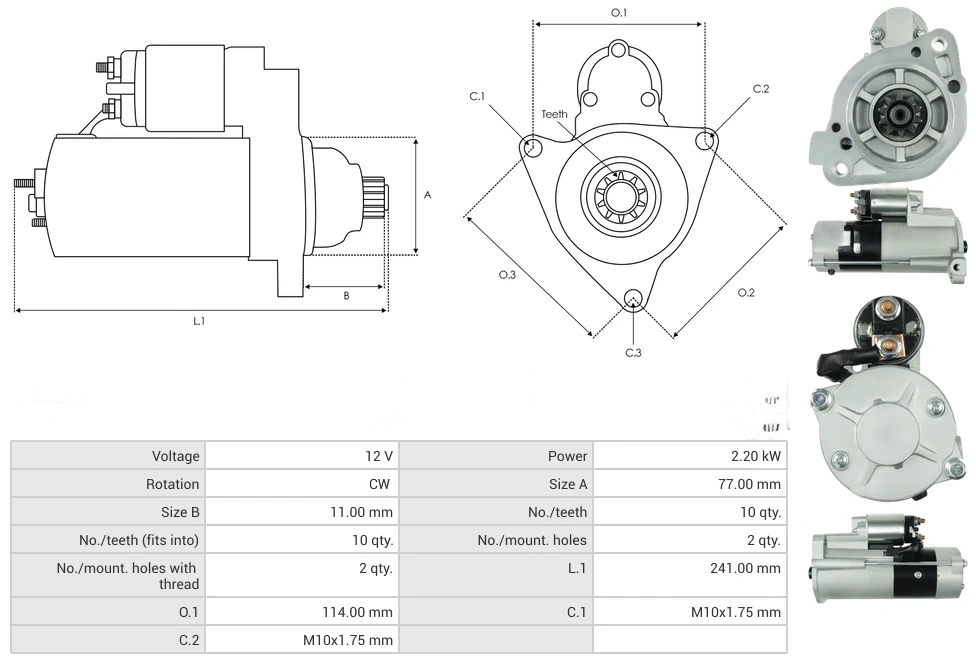 Starters Voltage [ V ] 12 Power [ kW ] 2.20 Rotation CW Size A [ mm ] 77.00 Size B [ mm ] 11.00 No./teeth [ qty. ] 10 No./teeth (fits into) [ qty. ] 10 No./mount. holes [ qty. ] 2 No./mount. holes with thread [ qty. ] 2 L.1 [ mm ] 241.00 O.1 [ mm ] 114.00 C.1 [ mm ] M10x1.75 C.2 [ mm ] M10x1.75