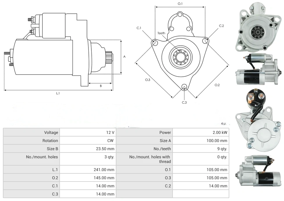 Starters Voltage [ V ] 12 Power [ kW ] 2.00 Rotation CW Size A [ mm ] 100.00 Size B [ mm ] 23.50 No./teeth [ qty. ] 9 No./mount. holes [ qty. ] 3 No./mount. holes with thread [ qty. ] 0 L.1 [ mm ] 241.00 O.1 [ mm ] 105.00 O.2 [ mm ] 145.00 O.3 [ mm ] 105.00 C.1 [ mm ] 14.00 C.2 [ mm ] 14.00 C.3 [ mm ] 14.00