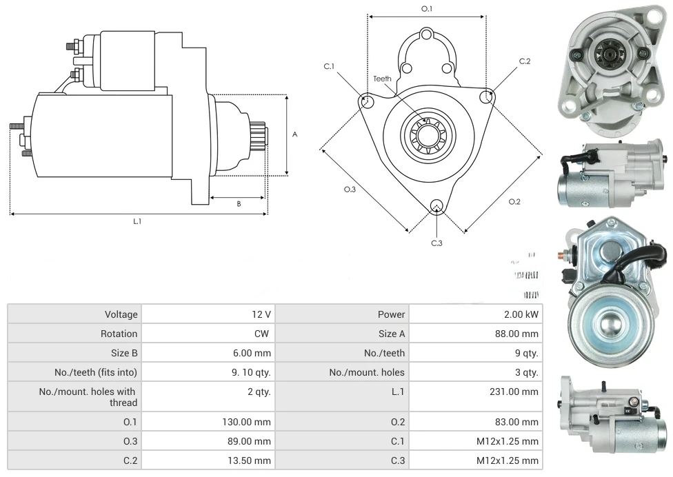Starters Voltage [ V ] 12 Power [ kW ] 2.00 Rotation CW Size A [ mm ] 88.00 Size B [ mm ] 6.00 No./teeth [ qty. ] 9 No./teeth (fits into) [ qty. ] 9. 10 No./mount. holes [ qty. ] 3 No./mount. holes with thread [ qty. ] 2 L.1 [ mm ] 231.00 O.1 [ mm ] 130.00 O.2 [ mm ] 83.00 O.3 [ mm ] 89.00 C.1 [ mm ] M12x1.25 C.2 [ mm ] 13.50 C.3 [ mm ] M12x1.25