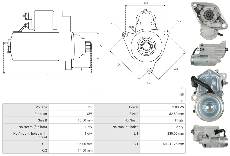 Starters Voltage [ V ] 12 Power [ kW ] 2.00 Rotation CW Size A [ mm ] 82.50 Size B [ mm ] 15.50 No./teeth [ qty. ] 11 No./teeth (fits into) [ qty. ] 11 No./mount. holes [ qty. ] 2 No./mount. holes with thread [ qty. ] 1 L.1 [ mm ] 230.00 O.1 [ mm ] 135.00 C.1 [ mm ] M12x1.25 C.2 [ mm ] 14.50