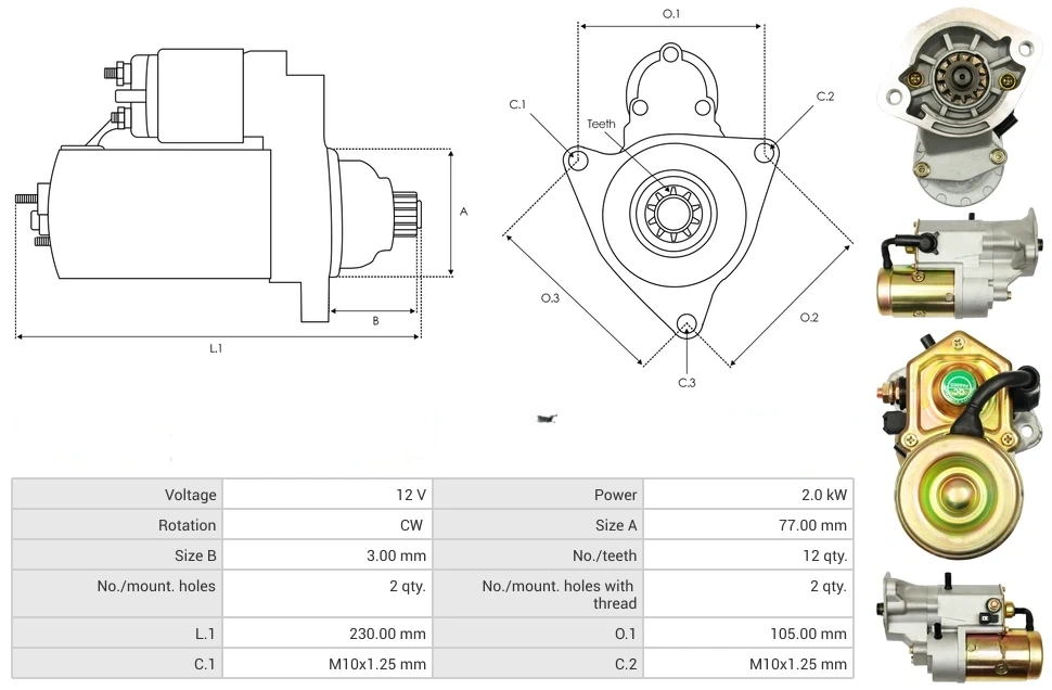 Starters Voltage [ V ] 12 Power [ kW ] 2.0 Rotation CW Size A [ mm ] 77.00 Size B [ mm ] 3.00 No./teeth [ qty. ] 12 No./mount. holes [ qty. ] 2 No./mount. holes with thread [ qty. ] 2 L.1 [ mm ] 230.00 O.1 [ mm ] 105.00 C.1 [ mm ] M10x1.25 C.2 [ mm ] M10x1.25