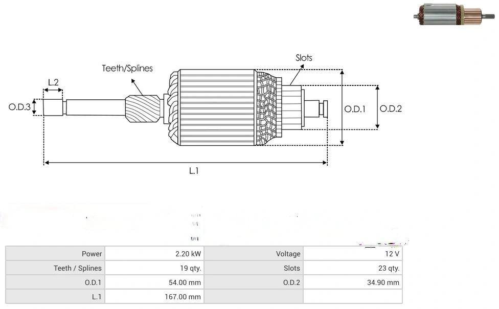 Starter armatures Power [ kW ] 2.20 Voltage [ V ] 12 Teeth / Splines [ qty. ] 19 Slots [ qty. ] 23 O.D.1 [ mm ] 54.00 O.D.2 [ mm ] 34.90 L.1 [ mm ] 167.00
