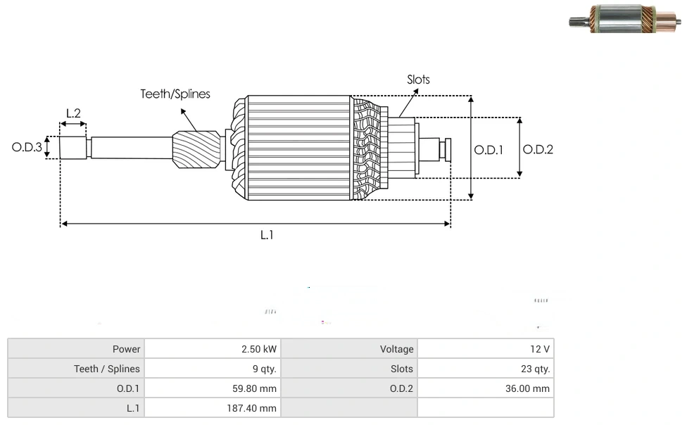 Starter armatures Power [ kW ] 2.50 Voltage [ V ] 12 Teeth / Splines [ qty. ] 9 Slots [ qty. ] 23 O.D.1 [ mm ] 59.80 O.D.2 [ mm ] 36.00 L.1 [ mm ] 187.40