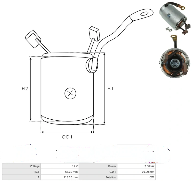 Starter yokes with field coils Voltage [ V ] 12 Power [ kW ] 2.00 I.D.1 [ mm ] 68.30 O.D.1 [ mm ] 76.00 L.1 [ mm ] 113.20 Rotation CW