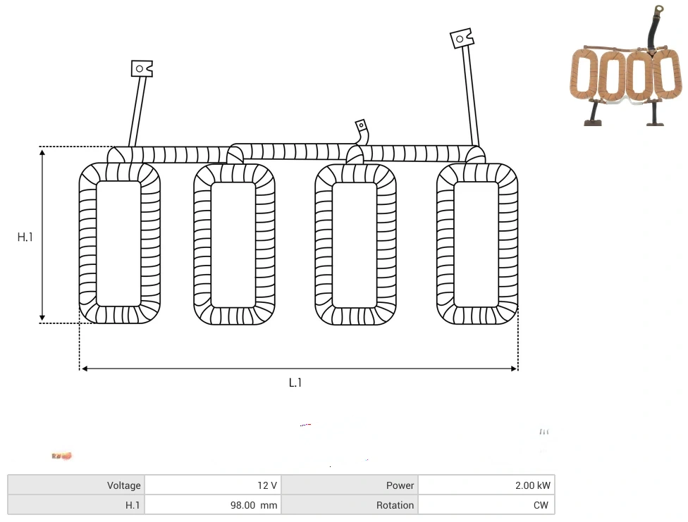 Starter field coils Voltage [ V ] 12 Power [ kW ] 2.00 H.1 [ mm ] 98.00 Rotation CW