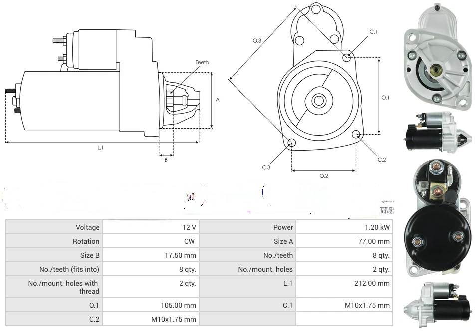 Starters Voltage [ V ] 12 Power [ kW ] 1.20 Rotation CW Size A [ mm ] 77.00 Size B [ mm ] 17.50 No./teeth [ qty. ] 8 No./teeth (fits into) [ qty. ] 8 No./mount. holes [ qty. ] 2 No./mount. holes with thread [ qty. ] 2 L.1 [ mm ] 212.00 O.1 [ mm ] 105.00 C.1 [ mm ] M10x1.75 C.2 [ mm ] M10x1.75