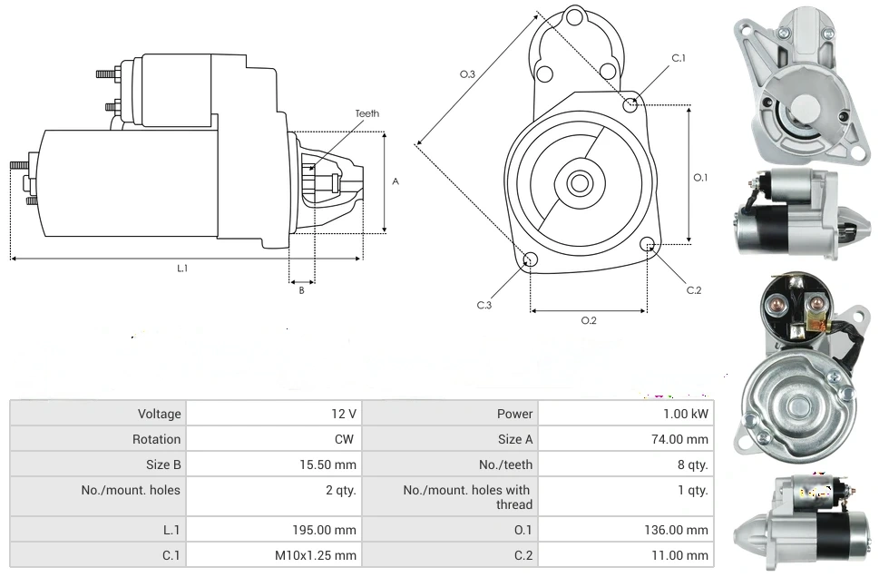 Starters Voltage [ V ] 12 Power [ kW ] 1.00 Rotation CW Size A [ mm ] 74.00 Size B [ mm ] 15.50 No./teeth [ qty. ] 8 No./mount. holes [ qty. ] 2 No./mount. holes with thread [ qty. ] 1 L.1 [ mm ] 195.00 O.1 [ mm ] 136.00 C.1 [ mm ] M10x1.25 C.2 [ mm ] 11.00