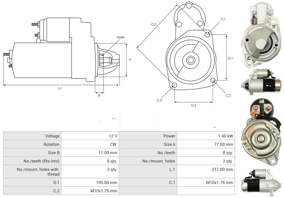 Starters Voltage [ V ] 12 Power [ kW ] 1.40 Rotation CW Size A [ mm ] 77.00 Size B [ mm ] 11.00 No./teeth [ qty. ] 8 No./teeth (fits into) [ qty. ] 8 No./mount. holes [ qty. ] 2 No./mount. holes with thread [ qty. ] 2 L.1 [ mm ] 217.00 O.1 [ mm ] 105.00 C.1 [ mm ] M10x1.75 C.2 [ mm ] M10x1.75