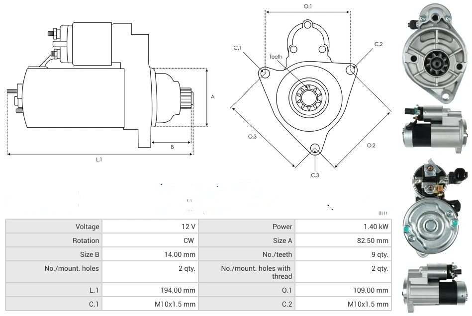 Starters Voltage [ V ] 12 Power [ kW ] 1.40 Rotation CW Size A [ mm ] 82.50 Size B [ mm ] 14.00 No./teeth [ qty. ] 9 No./mount. holes [ qty. ] 2 No./mount. holes with thread [ qty. ] 2 L.1 [ mm ] 194.00 O.1 [ mm ] 109.00 C.1 [ mm ] M10x1.5 C.2 [ mm ] M10x1.5