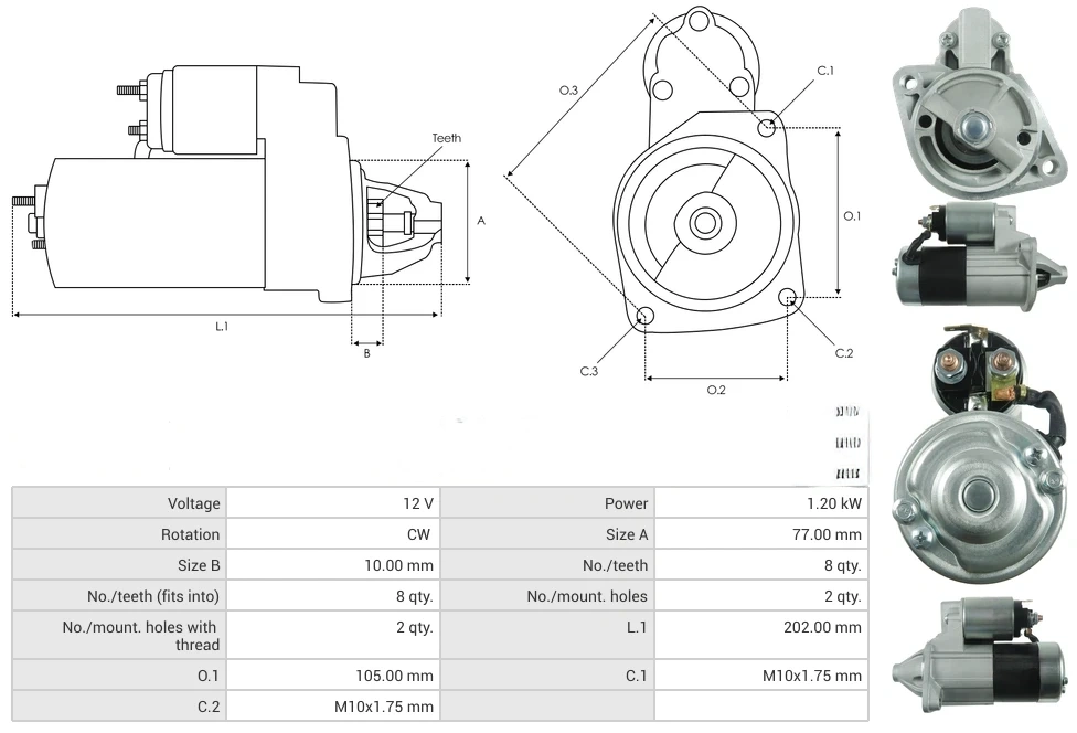Starters Voltage [ V ] 12 Power [ kW ] 1.20 Rotation CW Size A [ mm ] 77.00 Size B [ mm ] 10.00 No./teeth [ qty. ] 8 No./teeth (fits into) [ qty. ] 8 No./mount. holes [ qty. ] 2 No./mount. holes with thread [ qty. ] 2 L.1 [ mm ] 202.00 O.1 [ mm ] 105.00 C.1 [ mm ] M10x1.75 C.2 [ mm ] M10x1.75