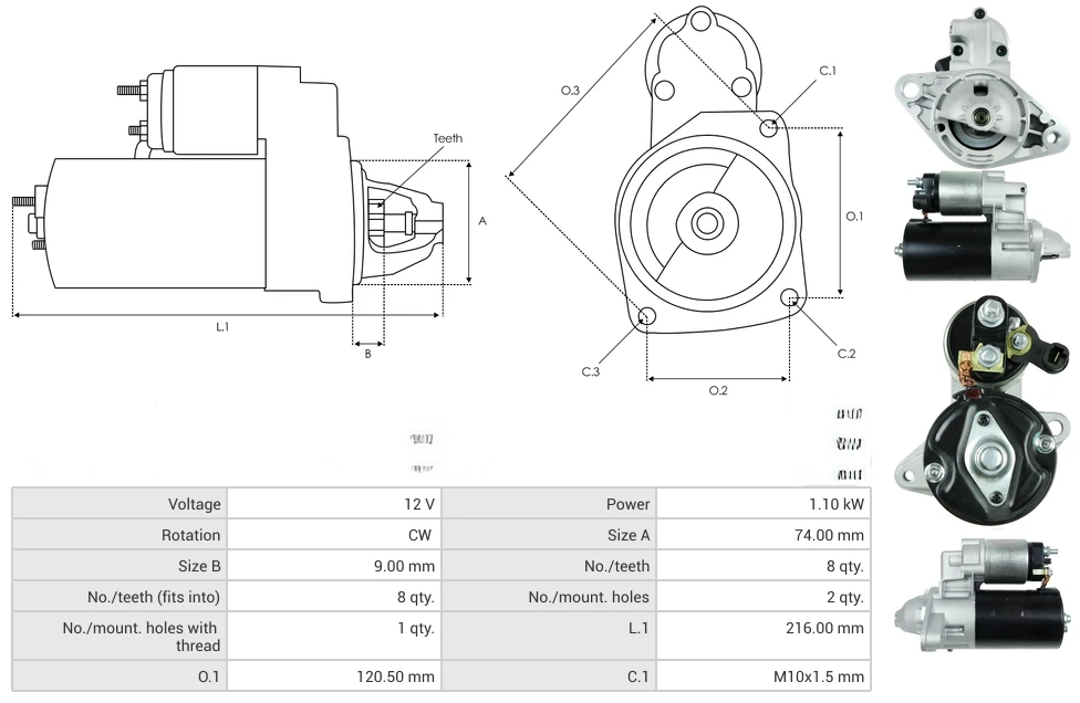 Starters Voltage [ V ] 12 Power [ kW ] 1.10 Rotation CW Size A [ mm ] 74.00 Size B [ mm ] 9.00 No./teeth [ qty. ] 8 No./teeth (fits into) [ qty. ] 8 No./mount. holes [ qty. ] 2 No./mount. holes with thread [ qty. ] 1 L.1 [ mm ] 216.00 O.1 [ mm ] 120.50 C.1 [ mm ] M10x1.5