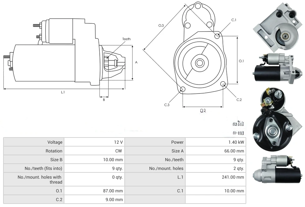 Starters Voltage [ V ] 12 Power [ kW ] 1.40 Rotation CW Size A [ mm ] 66.00 Size B [ mm ] 10.00 No./teeth [ qty. ] 9 No./teeth (fits into) [ qty. ] 9 No./mount. holes [ qty. ] 2 No./mount. holes with thread [ qty. ] 0 L.1 [ mm ] 241.00 O.1 [ mm ] 87.00 C.1 [ mm ] 10.00 C.2 [ mm ] 9.00