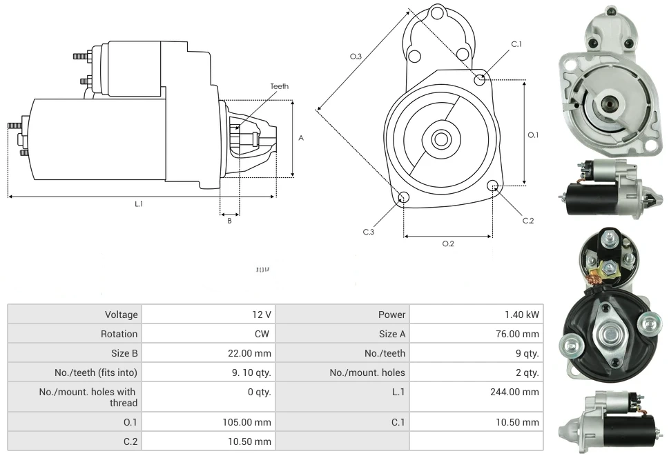 Starters Voltage [ V ] 12 Power [ kW ] 1.40 Rotation CW Size A [ mm ] 76.00 Size B [ mm ] 22.00 No./teeth [ qty. ] 9 No./teeth (fits into) [ qty. ] 9. 10 No./mount. holes [ qty. ] 2 No./mount. holes with thread [ qty. ] 0 L.1 [ mm ] 244.00 O.1 [ mm ] 105.00 C.1 [ mm ] 10.50 C.2 [ mm ] 10.50