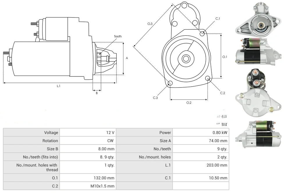 Starters Voltage [ V ] 12 Power [ kW ] 0.80 Rotation CW Size A [ mm ] 74.00 Size B [ mm ] 8.00 No./teeth [ qty. ] 9 No./teeth (fits into) [ qty. ] 8. 9 No./mount. holes [ qty. ] 2 No./mount. holes with thread [ qty. ] 1 L.1 [ mm ] 203.00 O.1 [ mm ] 132.00 C.1 [ mm ] 10.50 C.2 [ mm ] M10x1.5