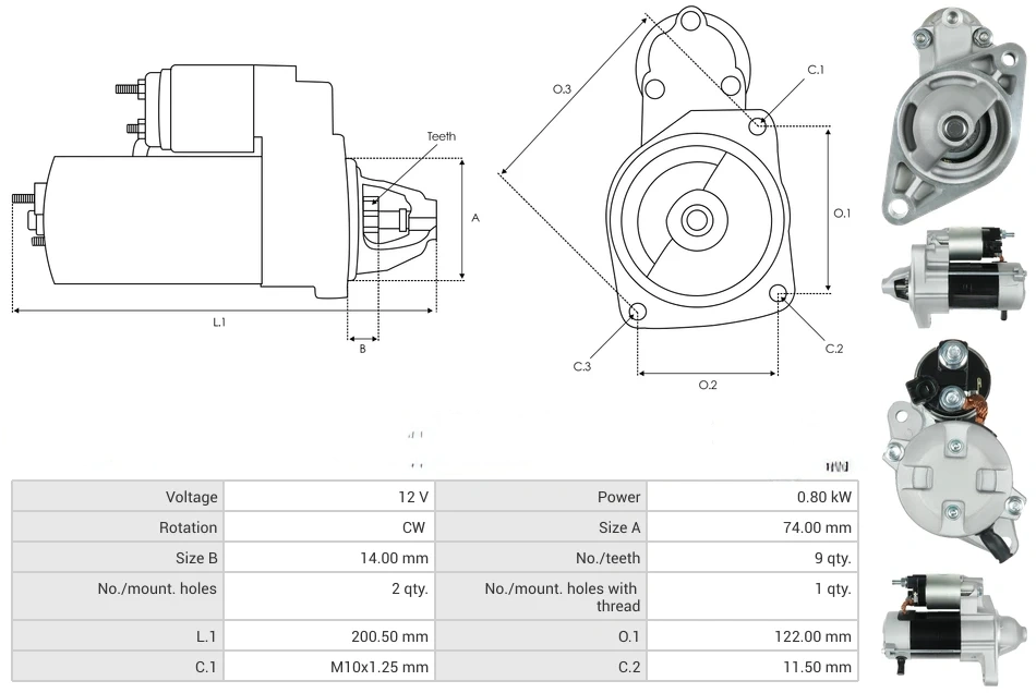 Starters Voltage [ V ] 12 Power [ kW ] 0.80 Rotation CW Size A [ mm ] 74.00 Size B [ mm ] 14.00 No./teeth [ qty. ] 9 No./mount. holes [ qty. ] 2 No./mount. holes with thread [ qty. ] 1 L.1 [ mm ] 200.50 O.1 [ mm ] 122.00 C.1 [ mm ] M10x1.25 C.2 [ mm ] 11.50