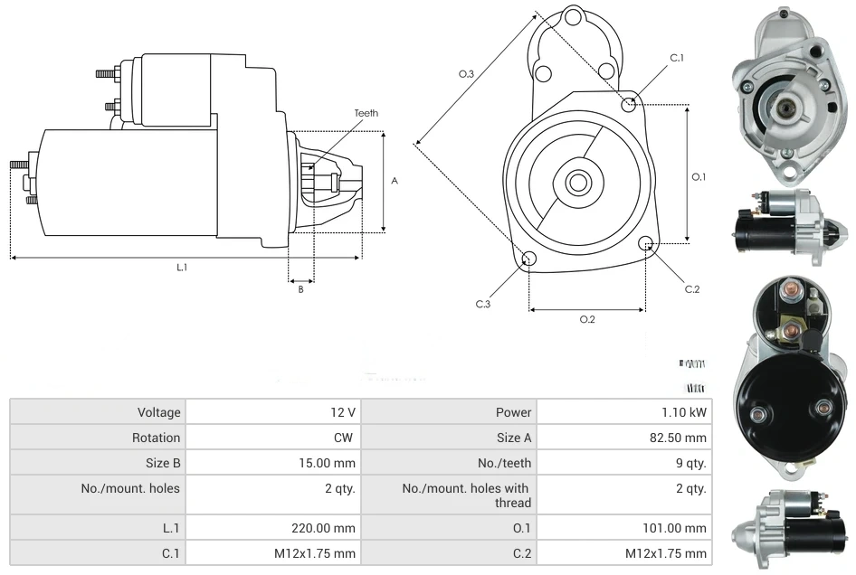 Starters Voltage [ V ] 12 Power [ kW ] 1.10 Rotation CW Size A [ mm ] 82.50 Size B [ mm ] 15.00 No./teeth [ qty. ] 9 No./mount. holes [ qty. ] 2 No./mount. holes with thread [ qty. ] 2 L.1 [ mm ] 220.00 O.1 [ mm ] 101.00 C.1 [ mm ] M12x1.75 C.2 [ mm ] M12x1.75