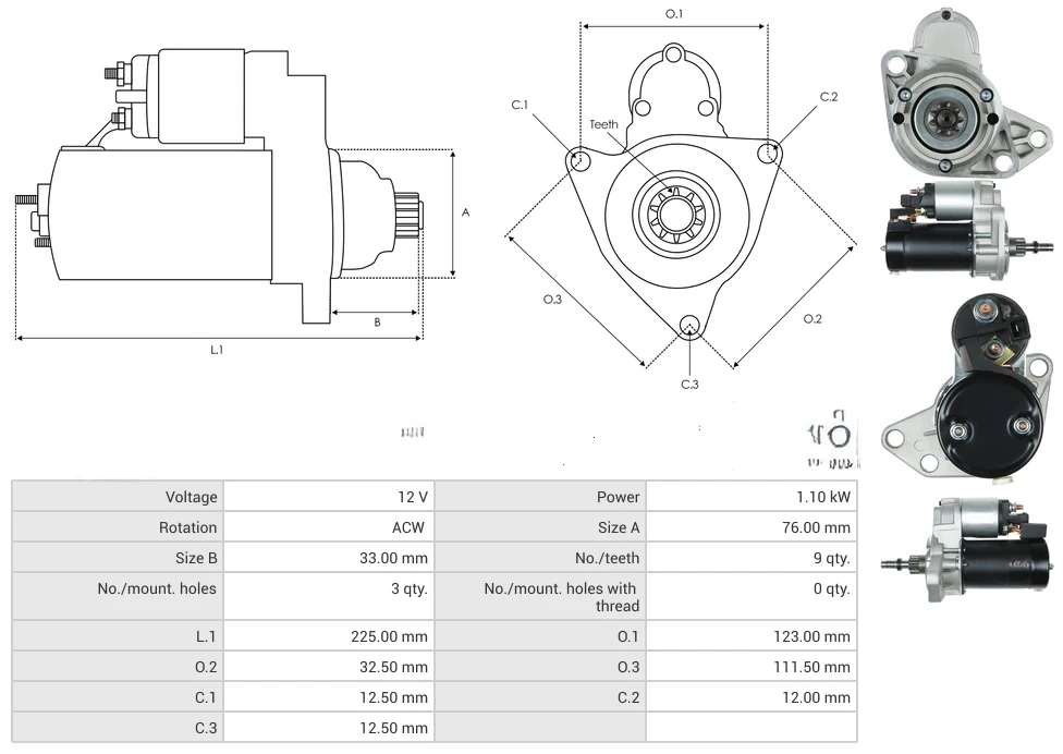 Starters Voltage [ V ] 12 Power [ kW ] 1.10 Rotation ACW Size A [ mm ] 76.00 Size B [ mm ] 33.00 No./teeth [ qty. ] 9 No./mount. holes [ qty. ] 3 No./mount. holes with thread [ qty. ] 0 L.1 [ mm ] 225.00 O.1 [ mm ] 123.00 O.2 [ mm ] 32.50 O.3 [ mm ] 111.50 C.1 [ mm ] 12.50 C.2 [ mm ] 12.00 C.3 [ mm ] 12.50