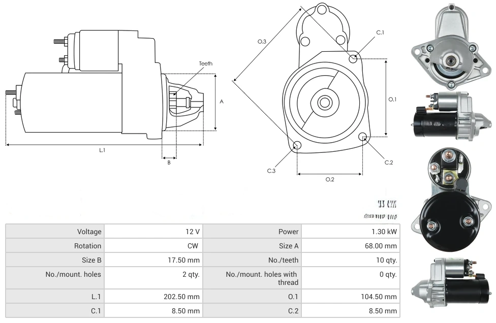 Starters Voltage [ V ] 12 Power [ kW ] 1.30 Rotation CW Size A [ mm ] 68.00 Size B [ mm ] 17.50 No./teeth [ qty. ] 10 No./mount. holes [ qty. ] 2 No./mount. holes with thread [ qty. ] 0 L.1 [ mm ] 202.50 O.1 [ mm ] 104.50 C.1 [ mm ] 8.50 C.2 [ mm ] 8.50