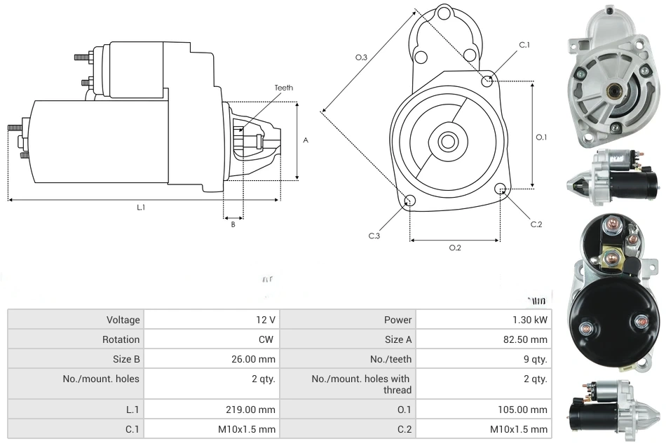 Starters Voltage [ V ] 12 Power [ kW ] 1.30 Rotation CW Size A [ mm ] 82.50 Size B [ mm ] 26.00 No./teeth [ qty. ] 9 No./mount. holes [ qty. ] 2 No./mount. holes with thread [ qty. ] 2 L.1 [ mm ] 219.00 O.1 [ mm ] 105.00 C.1 [ mm ] M10x1.5 C.2 [ mm ] M10x1.5