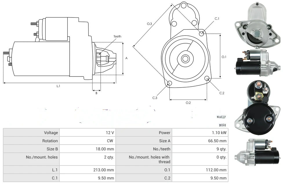 Starters Voltage [ V ] 12 Power [ kW ] 1.10 Rotation CW Size A [ mm ] 66.50 Size B [ mm ] 18.00 No./teeth [ qty. ] 9 No./mount. holes [ qty. ] 2 No./mount. holes with thread [ qty. ] 0 L.1 [ mm ] 213.00 O.1 [ mm ] 112.00 C.1 [ mm ] 9.50 C.2 [ mm ] 9.50