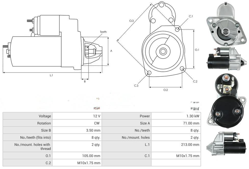 Starters Voltage [ V ] 12 Power [ kW ] 1.30 Rotation CW Size A [ mm ] 71.00 Size B [ mm ] 3.50 No./teeth [ qty. ] 8 No./teeth (fits into) [ qty. ] 8 No./mount. holes [ qty. ] 2 No./mount. holes with thread [ qty. ] 2 L.1 [ mm ] 213.00 O.1 [ mm ] 105.00 C.1 [ mm ] M10x1.75 C.2 [ mm ] M10x1.75