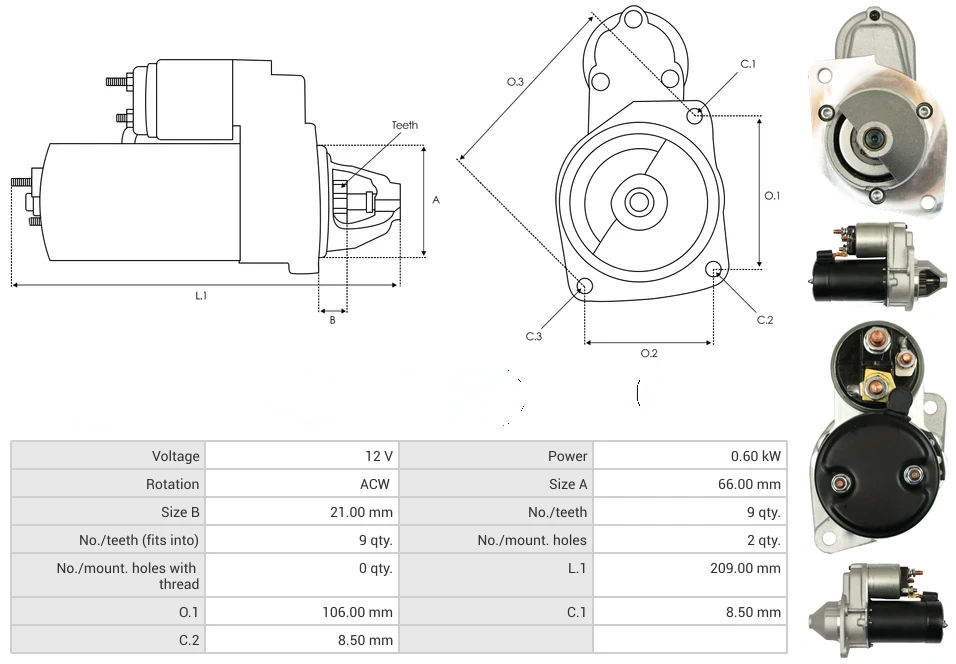 Starters Voltage [ V ] 12 Power [ kW ] 0.60 Rotation ACW Size A [ mm ] 66.00 Size B [ mm ] 21.00 No./teeth [ qty. ] 9 No./teeth (fits into) [ qty. ] 9 No./mount. holes [ qty. ] 2 No./mount. holes with thread [ qty. ] 0 L.1 [ mm ] 209.00 O.1 [ mm ] 106.00 C.1 [ mm ] 8.50 C.2 [ mm ] 8.50