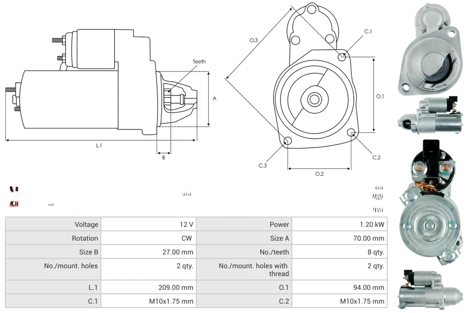 Starters Voltage [ V ] 12 Power [ kW ] 1.20 Rotation CW Size A [ mm ] 70.00 Size B [ mm ] 27.00 No./teeth [ qty. ] 8 No./mount. holes [ qty. ] 2 No./mount. holes with thread [ qty. ] 2 L.1 [ mm ] 209.00 O.1 [ mm ] 94.00 C.1 [ mm ] M10x1.75 C.2 [ mm ] M10x1.75