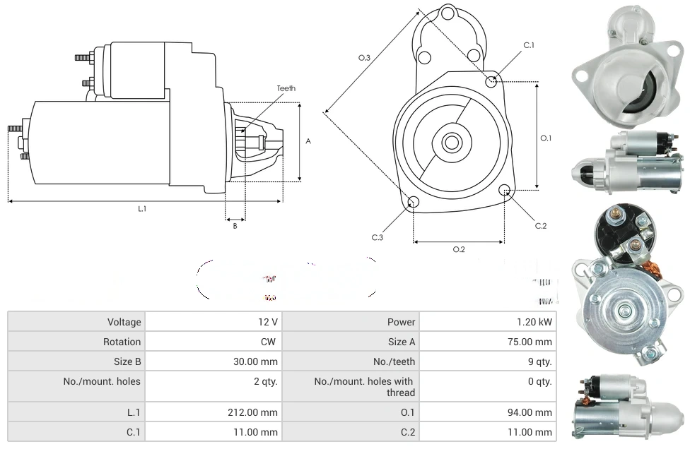 Starters Voltage [ V ] 12 Power [ kW ] 1.20 Rotation CW Size A [ mm ] 75.00 Size B [ mm ] 30.00 No./teeth [ qty. ] 9 No./mount. holes [ qty. ] 2 No./mount. holes with thread [ qty. ] 0 L.1 [ mm ] 212.00 O.1 [ mm ] 94.00 C.1 [ mm ] 11.00 C.2 [ mm ] 11.00