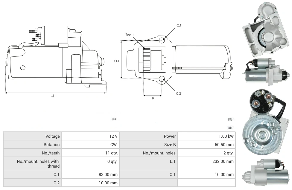 Starters Voltage [ V ] 12 Power [ kW ] 1.60 Rotation CW Size B [ mm ] 60.50 No./teeth [ qty. ] 11 No./mount. holes [ qty. ] 2 No./mount. holes with thread [ qty. ] 0 L.1 [ mm ] 232.00 O.1 [ mm ] 83.00 C.1 [ mm ] 10.00 C.2 [ mm ] 10.00