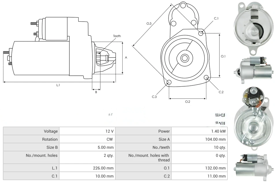 Starters Voltage [ V ] 12 Power [ kW ] 1.40 Rotation CW Size A [ mm ] 104.00 Size B [ mm ] 5.00 No./teeth [ qty. ] 10 No./mount. holes [ qty. ] 2 No./mount. holes with thread [ qty. ] 0 L.1 [ mm ] 226.00 O.1 [ mm ] 132.00 C.1 [ mm ] 10.00 C.2 [ mm ] 11.00