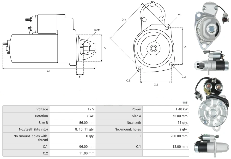 Starters Voltage [ V ] 12 Power [ kW ] 1.40 Rotation ACW Size A [ mm ] 75.00 Size B [ mm ] 56.00 No./teeth [ qty. ] 11 No./teeth (fits into) [ qty. ] 8. 10. 11 No./mount. holes [ qty. ] 2 No./mount. holes with thread [ qty. ] 0 L.1 [ mm ] 230.00 O.1 [ mm ] 96.00 C.1 [ mm ] 13.00 C.2 [ mm ] 11.00