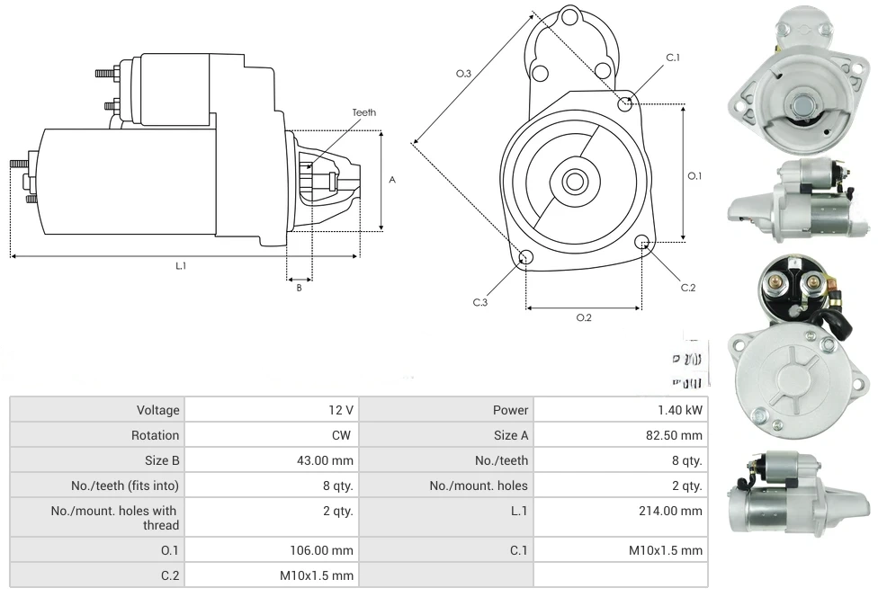 Starters Voltage [ V ] 12 Power [ kW ] 1.40 Rotation CW Size A [ mm ] 82.50 Size B [ mm ] 43.00 No./teeth [ qty. ] 8 No./teeth (fits into) [ qty. ] 8 No./mount. holes [ qty. ] 2 No./mount. holes with thread [ qty. ] 2 L.1 [ mm ] 214.00 O.1 [ mm ] 106.00 C.1 [ mm ] M10x1.5 C.2 [ mm ] M10x1.5