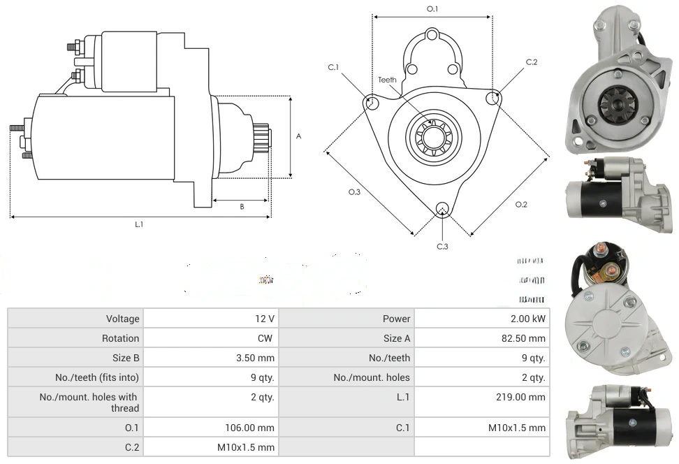 Starters Voltage [ V ] 12 Power [ kW ] 2.00 Rotation CW Size A [ mm ] 82.50 Size B [ mm ] 3.50 No./teeth [ qty. ] 9 No./teeth (fits into) [ qty. ] 9 No./mount. holes [ qty. ] 2 No./mount. holes with thread [ qty. ] 2 L.1 [ mm ] 219.00 O.1 [ mm ] 106.00 C.1 [ mm ] M10x1.5 C.2 [ mm ] M10x1.5