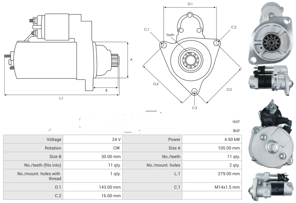 Starters Voltage [ V ] 24 Power [ kW ] 4.50 Rotation CW Size A [ mm ] 105.00 Size B [ mm ] 30.00 No./teeth [ qty. ] 11 No./teeth (fits into) [ qty. ] 11 No./mount. holes [ qty. ] 2 No./mount. holes with thread [ qty. ] 1 L.1 [ mm ] 279.00 O.1 [ mm ] 143.00 C.1 [ mm ] M14x1.5 C.2 [ mm ] 16.00