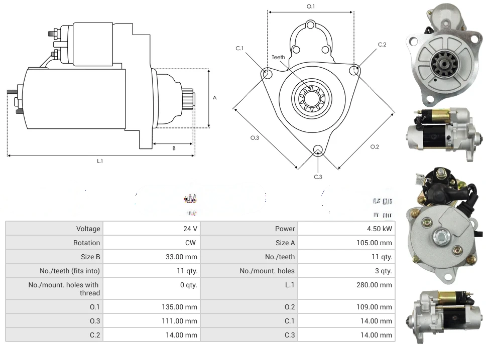 Starters Voltage [ V ] 24 Power [ kW ] 4.50 Rotation CW Size A [ mm ] 105.00 Size B [ mm ] 33.00 No./teeth [ qty. ] 11 No./teeth (fits into) [ qty. ] 11 No./mount. holes [ qty. ] 3 No./mount. holes with thread [ qty. ] 0 L.1 [ mm ] 280.00 O.1 [ mm ] 135.00 O.2 [ mm ] 109.00 O.3 [ mm ] 111.00 C.1 [ mm ] 14.00 C.2 [ mm ] 14.00 C.3 [ mm ] 14.00