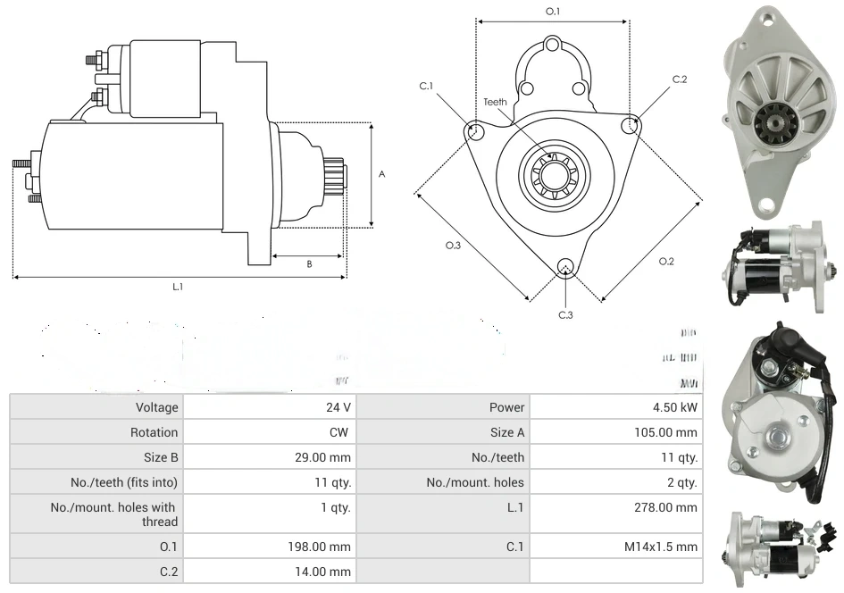 Starters Voltage [ V ] 24 Power [ kW ] 4.50 Rotation CW Size A [ mm ] 105.00 Size B [ mm ] 29.00 No./teeth [ qty. ] 11 No./teeth (fits into) [ qty. ] 11 No./mount. holes [ qty. ] 2 No./mount. holes with thread [ qty. ] 1 L.1 [ mm ] 278.00 O.1 [ mm ] 198.00 C.1 [ mm ] M14x1.5 C.2 [ mm ] 14.00