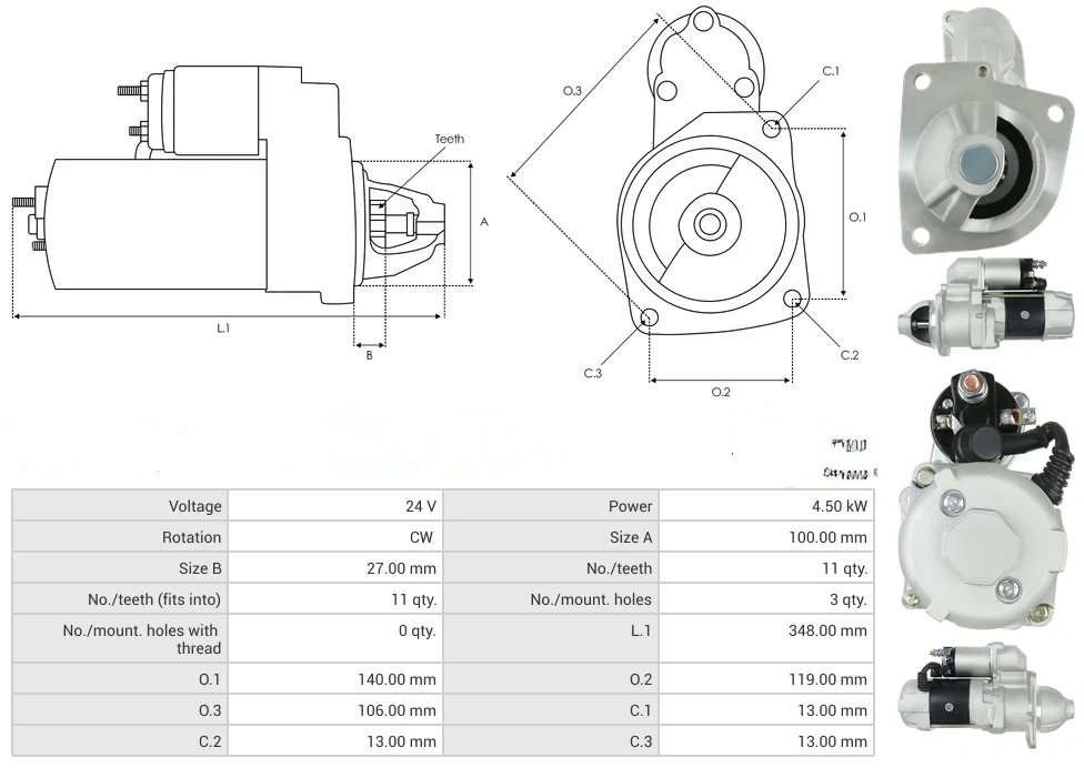 Starters Voltage [ V ] 24 Power [ kW ] 4.50 Rotation CW Size A [ mm ] 100.00 Size B [ mm ] 27.00 No./teeth [ qty. ] 11 No./teeth (fits into) [ qty. ] 11 No./mount. holes [ qty. ] 3 No./mount. holes with thread [ qty. ] 0 L.1 [ mm ] 348.00 O.1 [ mm ] 140.00 O.2 [ mm ] 119.00 O.3 [ mm ] 106.00 C.1 [ mm ] 13.00 C.2 [ mm ] 13.00 C.3 [ mm ] 13.00