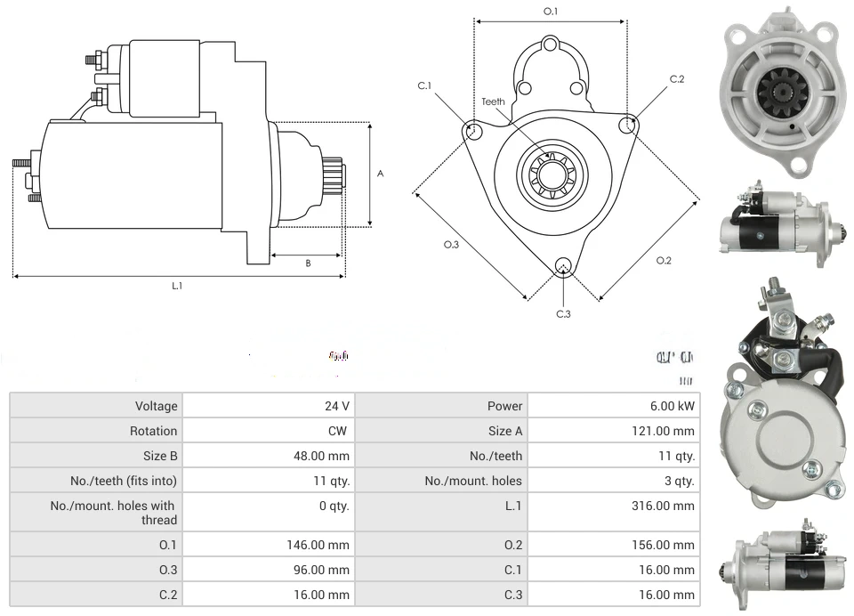 Starters Voltage [ V ] 24 Power [ kW ] 6.00 Rotation CW Size A [ mm ] 121.00 Size B [ mm ] 48.00 No./teeth [ qty. ] 11 No./teeth (fits into) [ qty. ] 11 No./mount. holes [ qty. ] 3 No./mount. holes with thread [ qty. ] 0 L.1 [ mm ] 316.00 O.1 [ mm ] 146.00 O.2 [ mm ] 156.00 O.3 [ mm ] 96.00 C.1 [ mm ] 16.00 C.2 [ mm ] 16.00 C.3 [ mm ] 16.00