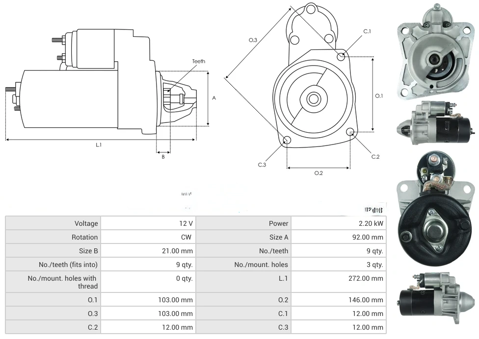 Starters Voltage [ V ] 12 Power [ kW ] 2.20 Rotation CW Size A [ mm ] 92.00 Size B [ mm ] 21.00 No./teeth [ qty. ] 9 No./teeth (fits into) [ qty. ] 9 No./mount. holes [ qty. ] 3 No./mount. holes with thread [ qty. ] 0 L.1 [ mm ] 272.00 O.1 [ mm ] 103.00 O.2 [ mm ] 146.00 O.3 [ mm ] 103.00 C.1 [ mm ] 12.00 C.2 [ mm ] 12.00 C.3 [ mm ] 12.00