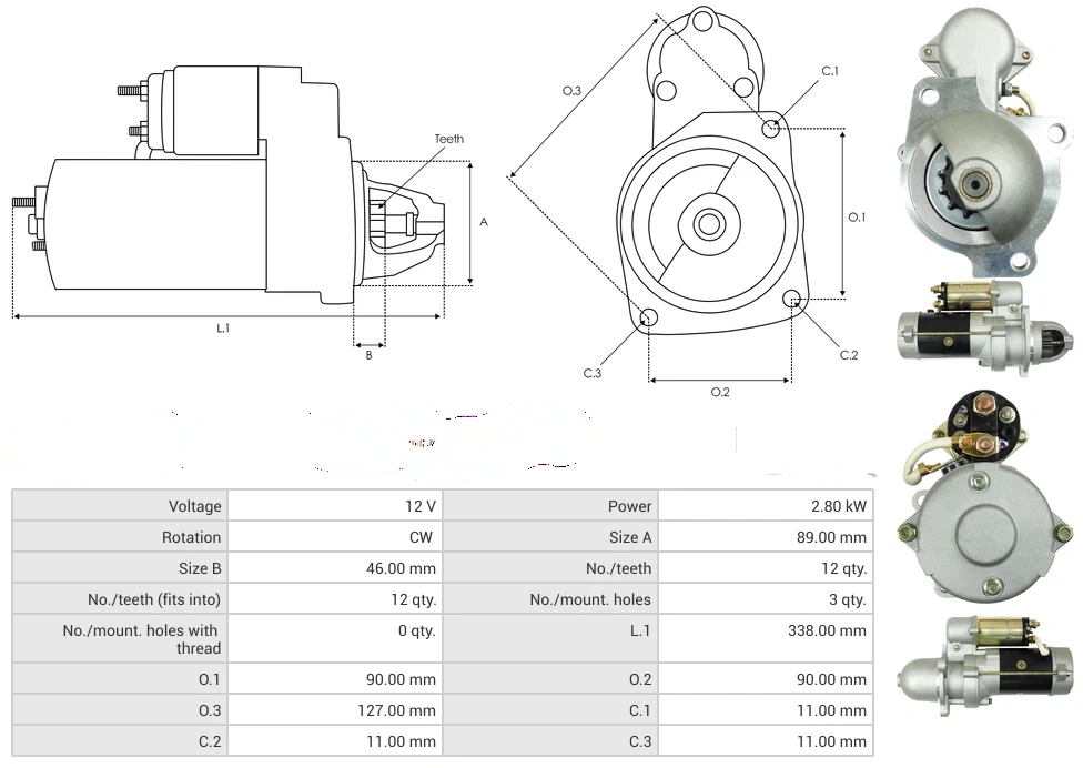 Starters Voltage [ V ] 12 Power [ kW ] 2.80 Rotation CW Size A [ mm ] 89.00 Size B [ mm ] 46.00 No./teeth [ qty. ] 12 No./teeth (fits into) [ qty. ] 12 No./mount. holes [ qty. ] 3 No./mount. holes with thread [ qty. ] 0 L.1 [ mm ] 338.00 O.1 [ mm ] 90.00 O.2 [ mm ] 90.00 O.3 [ mm ] 127.00 C.1 [ mm ] 11.00 C.2 [ mm ] 11.00 C.3 [ mm ] 11.00