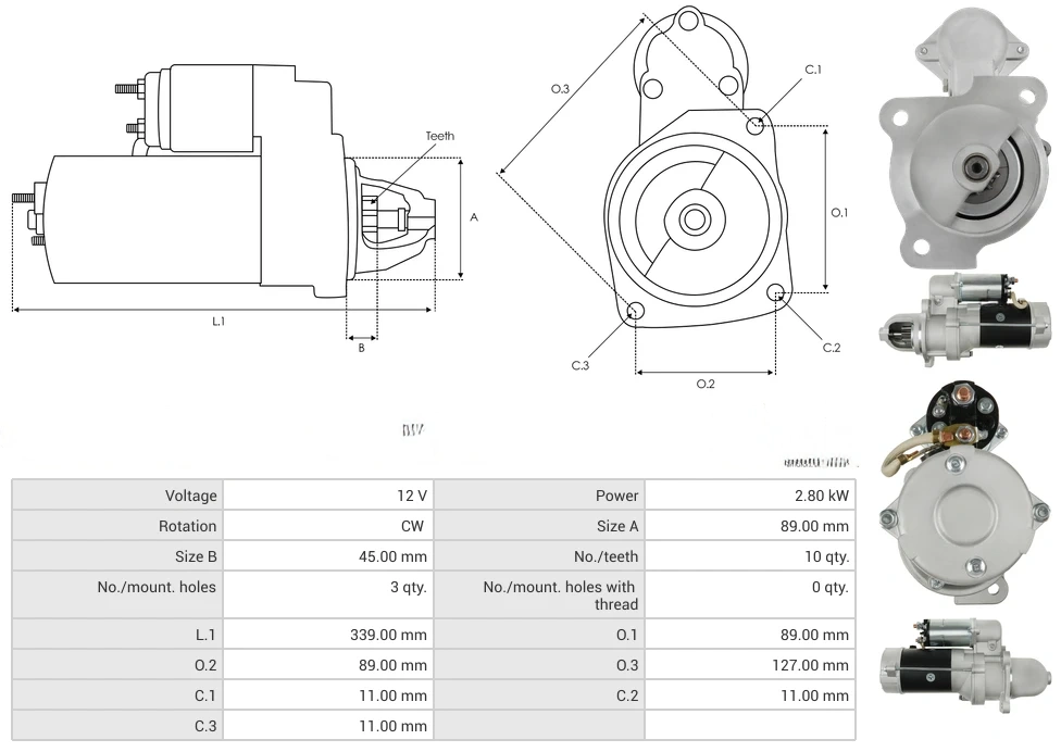 Starters Voltage [ V ] 12 Power [ kW ] 2.80 Rotation CW Size A [ mm ] 89.00 Size B [ mm ] 45.00 No./teeth [ qty. ] 10 No./mount. holes [ qty. ] 3 No./mount. holes with thread [ qty. ] 0 L.1 [ mm ] 339.00 O.1 [ mm ] 89.00 O.2 [ mm ] 89.00 O.3 [ mm ] 127.00 C.1 [ mm ] 11.00 C.2 [ mm ] 11.00 C.3 [ mm ] 11.00