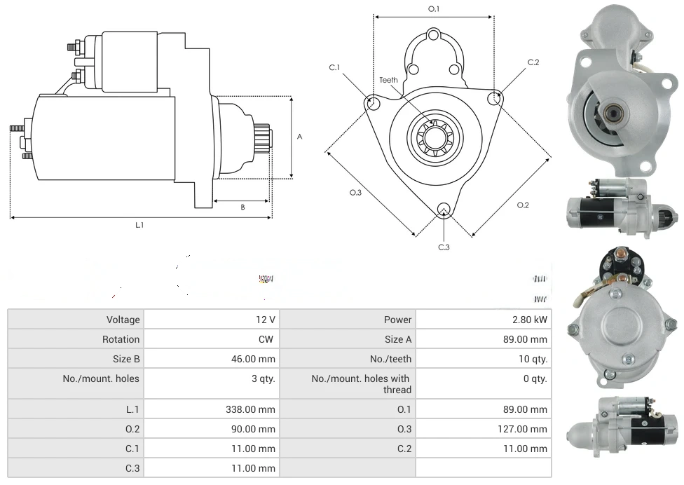 Starters Voltage [ V ] 12 Power [ kW ] 2.80 Rotation CW Size A [ mm ] 89.00 Size B [ mm ] 46.00 No./teeth [ qty. ] 10 No./mount. holes [ qty. ] 3 No./mount. holes with thread [ qty. ] 0 L.1 [ mm ] 338.00 O.1 [ mm ] 89.00 O.2 [ mm ] 90.00 O.3 [ mm ] 127.00 C.1 [ mm ] 11.00 C.2 [ mm ] 11.00 C.3 [ mm ] 11.00