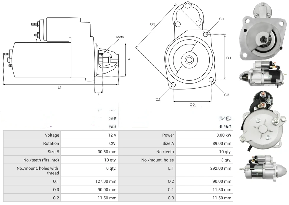 Starters Voltage [ V ] 12 Power [ kW ] 3.00 Rotation CW Size A [ mm ] 89.00 Size B [ mm ] 30.50 No./teeth [ qty. ] 10 No./teeth (fits into) [ qty. ] 10 No./mount. holes [ qty. ] 3 No./mount. holes with thread [ qty. ] 0 L.1 [ mm ] 292.00 O.1 [ mm ] 127.00 O.2 [ mm ] 90.00 O.3 [ mm ] 90.00 C.1 [ mm ] 11.50 C.2 [ mm ] 11.50 C.3 [ mm ] 11.50