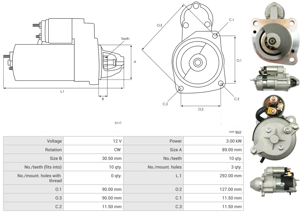 Starters Voltage [ V ] 12 Power [ kW ] 3.00 Rotation CW Size A [ mm ] 89.00 Size B [ mm ] 30.50 No./teeth [ qty. ] 10 No./teeth (fits into) [ qty. ] 10 No./mount. holes [ qty. ] 3 No./mount. holes with thread [ qty. ] 0 L.1 [ mm ] 292.00 O.1 [ mm ] 90.00 O.2 [ mm ] 127.00 O.3 [ mm ] 90.00 C.1 [ mm ] 11.50 C.2 [ mm ] 11.50 C.3 [ mm ] 11.50