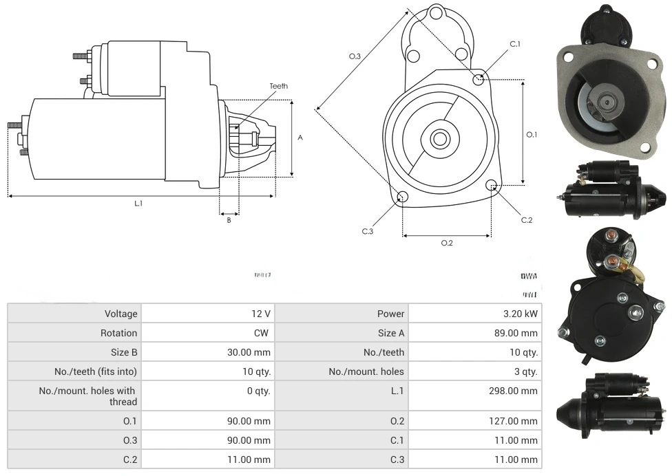 Starters Voltage [ V ] 12 Power [ kW ] 3.20 Rotation CW Size A [ mm ] 89.00 Size B [ mm ] 30.00 No./teeth [ qty. ] 10 No./teeth (fits into) [ qty. ] 10 No./mount. holes [ qty. ] 3 No./mount. holes with thread [ qty. ] 0 L.1 [ mm ] 298.00 O.1 [ mm ] 90.00 O.2 [ mm ] 127.00 O.3 [ mm ] 90.00 C.1 [ mm ] 11.00 C.2 [ mm ] 11.00 C.3 [ mm ] 11.00