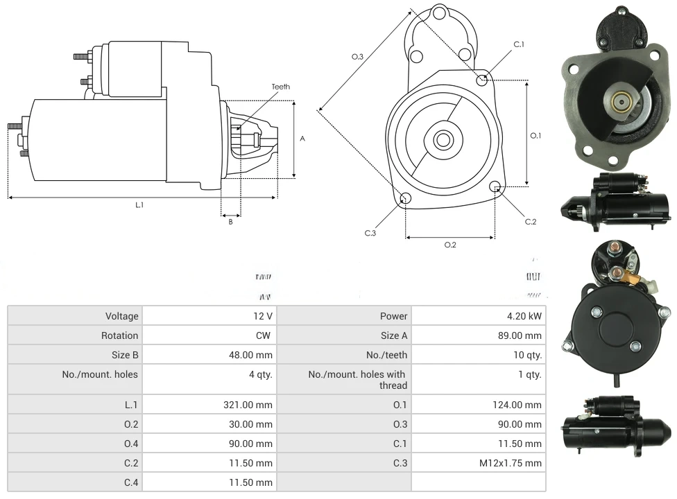 Starters Voltage [ V ] 12 Power [ kW ] 4.20 Rotation CW Size A [ mm ] 89.00 Size B [ mm ] 48.00 No./teeth [ qty. ] 10 No./mount. holes [ qty. ] 4 No./mount. holes with thread [ qty. ] 1 L.1 [ mm ] 321.00 O.1 [ mm ] 124.00 O.2 [ mm ] 30.00 O.3 [ mm ] 90.00 O.4 [ mm ] 90.00 C.1 [ mm ] 11.50 C.2 [ mm ] 11.50 C.3 [ mm ] M12x1.75 C.4 [ mm ] 11.50