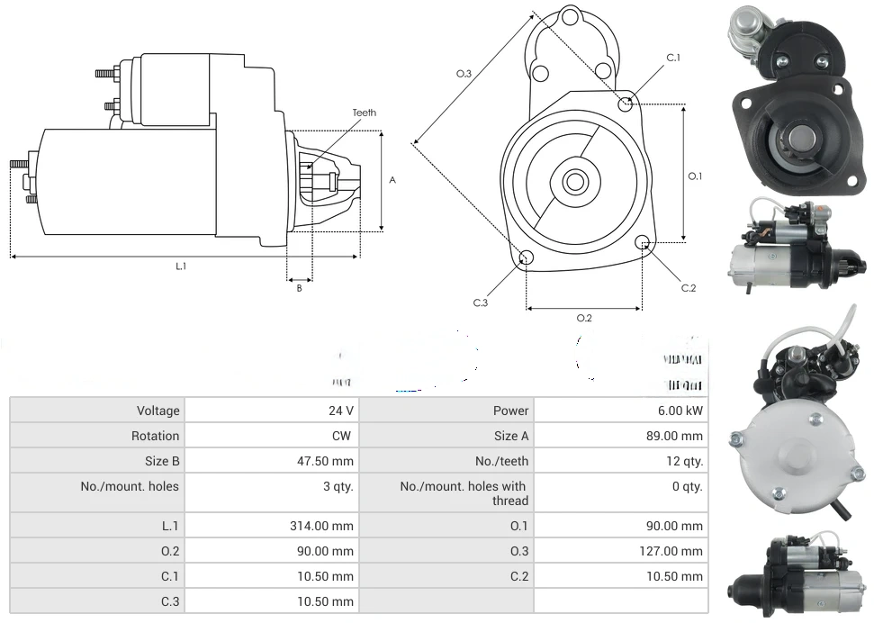 Starters Voltage [ V ] 24 Power [ kW ] 6.00 Rotation CW Size A [ mm ] 89.00 Size B [ mm ] 47.50 No./teeth [ qty. ] 12 No./mount. holes [ qty. ] 3 No./mount. holes with thread [ qty. ] 0 L.1 [ mm ] 314.00 O.1 [ mm ] 90.00 O.2 [ mm ] 90.00 O.3 [ mm ] 127.00 C.1 [ mm ] 10.50 C.2 [ mm ] 10.50 C.3 [ mm ] 10.50