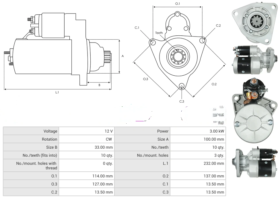 Starters Voltage [ V ] 12 Power [ kW ] 3.00 Rotation CW Size A [ mm ] 100.00 Size B [ mm ] 33.00 No./teeth [ qty. ] 10 No./teeth (fits into) [ qty. ] 10 No./mount. holes [ qty. ] 3 No./mount. holes with thread [ qty. ] 0 L.1 [ mm ] 232.00 O.1 [ mm ] 114.00 O.2 [ mm ] 137.00 O.3 [ mm ] 127.00 C.1 [ mm ] 13.50 C.2 [ mm ] 13.50 C.3 [ mm ] 13.50