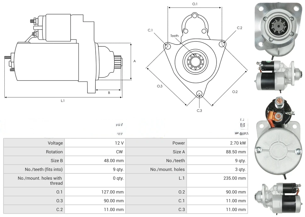Starters Voltage [ V ] 12 Power [ kW ] 2.70 Rotation CW Size A [ mm ] 88.50 Size B [ mm ] 48.00 No./teeth [ qty. ] 9 No./teeth (fits into) [ qty. ] 9 No./mount. holes [ qty. ] 3 No./mount. holes with thread [ qty. ] 0 L.1 [ mm ] 235.00 O.1 [ mm ] 127.00 O.2 [ mm ] 90.00 O.3 [ mm ] 90.00 C.1 [ mm ] 11.00 C.2 [ mm ] 11.00 C.3 [ mm ] 11.00